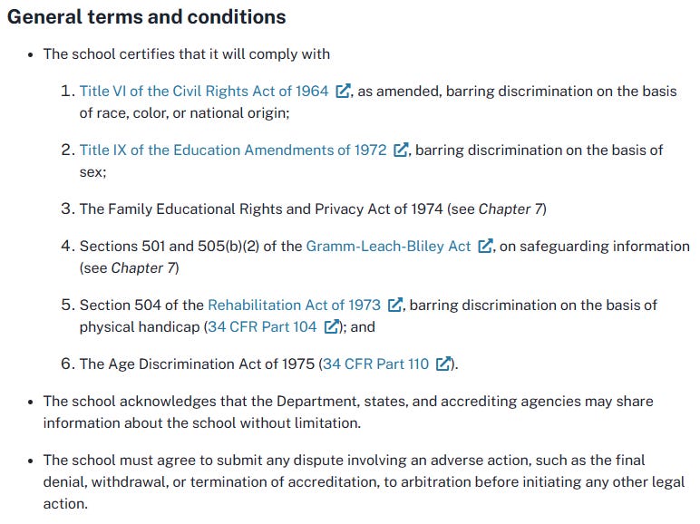 Federal student loans are quite similar. In order for a school to participate in federal aid programs, there is a lengthy and detailed application process. Among the many other stipulations for participation, the school must certify its compliance with various federal laws and regulations.