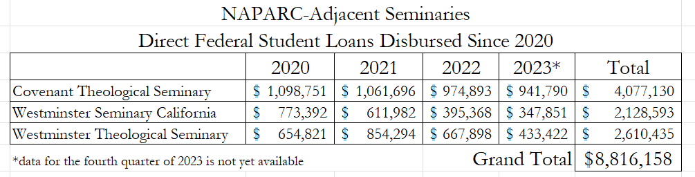 It is no secret that if seminaries are going to operate, they need money. Salaries must be paid, facilities must be acquired, built, and maintained, the lights have to stay on, it’s not a simple or cheap enterprise. But not all money is created equally. When seminaries participate in any student loan programs, it means that students are indebting themselves to attend. This means that post-seminary life is going to require the graduate (if he graduates) to make payments, which can be large and lengthy depending on the amount and terms of the particular loans. Given that seminaries are private institutions, their tuition and fees are relatively high. At the time of posting, Covenant’s per-credit tuition was listed as $595, meaning that the full tuition cost of their 99-credit Master of Divinity (the standard educational credential for Reformed ministers) is $58,905. WSCAL’s 110-credit program at $495 per credit totals $54,450. WTS’ 111-credit MDiv will cost $136,530 in tuition at a whopping $1,230 per credit hour. Remember, this is just tuition, all housing, books, fees, and other associated costs are not included. For students who attend full-time and in-residence, this cost typically comes on top of having either no or limited paying employment. Now, there are scholarships and other financial aid to help mitigate some of these costs. Still, the fact that these loans are used means that not all of the costs are being met. For Covenant, the largest user of federal loans of the three, the equivalent to the tuition cost of 70 MDivs has been floated by federal money in the last 4 years.